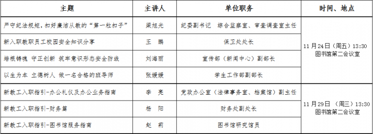 为贯彻落实好我校新进教职工岗前“校本课程”培训计划,现将11月下旬的专题讲座安排通知如下: