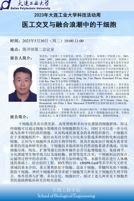 宋克东:大连理工大学研究员,博导,工学博士,帝国理工学院博士后。2005-2006、2007、2008-2009、2010等作为访问学者和博士后赴牛津大学、帝国理工学院和悉尼大学等进行合作研究。受邀担任国家自然科学基金委生命科学部评审专家,中国博士后基金、博新计划评审专家;TERMIS会员,ISSCR会员,IFMBE会员,中国细胞生物学会会员;中国医促会创伤医学分会组织修复与生物材料学组委员,《中国组织工程研究》学科编委,辽宁省细胞生物学会分子生物学专委会常务理事,辽宁省细胞生物学会中药化学专委会副主委等。受邀担任Int. J. Bioprint., Curr. Cancer. Drug. Tar., Curr. Pharm. Biotechnol.和Curr. Stem. Cell. Res. Ther.等多家国际刊物编委。
